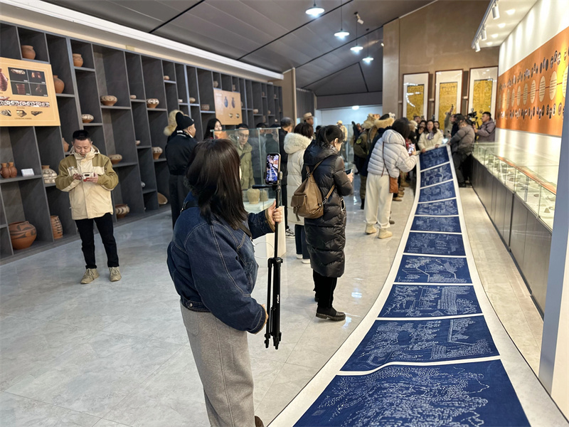 步入彩陶館,駱駝隊(duì)隊(duì)員們被仰韶文化的厚重底蘊(yùn)深深吸引。在公司董事長(zhǎng)暨三門峽市仰韶文化非遺傳承人王新軍的引領(lǐng)下,他們凝視著館藏彩陶上那些流轉(zhuǎn)千年的紋樣,手撫仿制陶器,驚嘆于七千年前仰韶先民已經(jīng)掌握礦物顏料繪制、高溫?zé)频木抗に嚕脖唤Y(jié)合三門峽特色非遺板藍(lán)根印染技藝的十米仰韶先民生活圖所震撼。